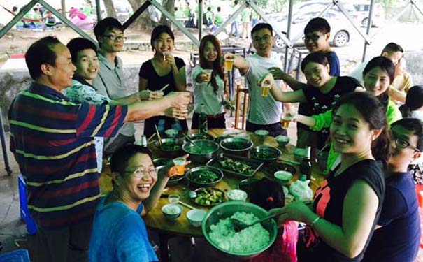 ? ?天公作美,當我們到達山腳下時雨停了。雨后的空氣隔外清新,一路上我們有說有笑,難走的山路大家相互攙扶。到達山頂,我們分工合作,洗菜、切菜、炒菜井井有條,很快我們共同完成了一頓美味的午餐。