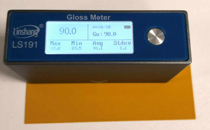 小編看了一下客戶的樣品,是以普通的鐵片為載體,將油漆均勻地涂抹在鐵片的表面,來測試這款油漆的光澤度的,客戶用了林上科技油漆光澤度儀LS191測試,數據如下: